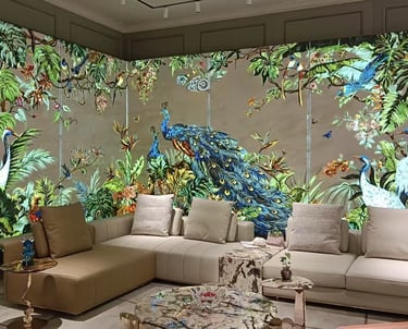 Solution: We designed a large-scale peacock mural with vibrant blues and golds, using Feng Shui principles to enhance energy flow and natural gemstones for sustainability.